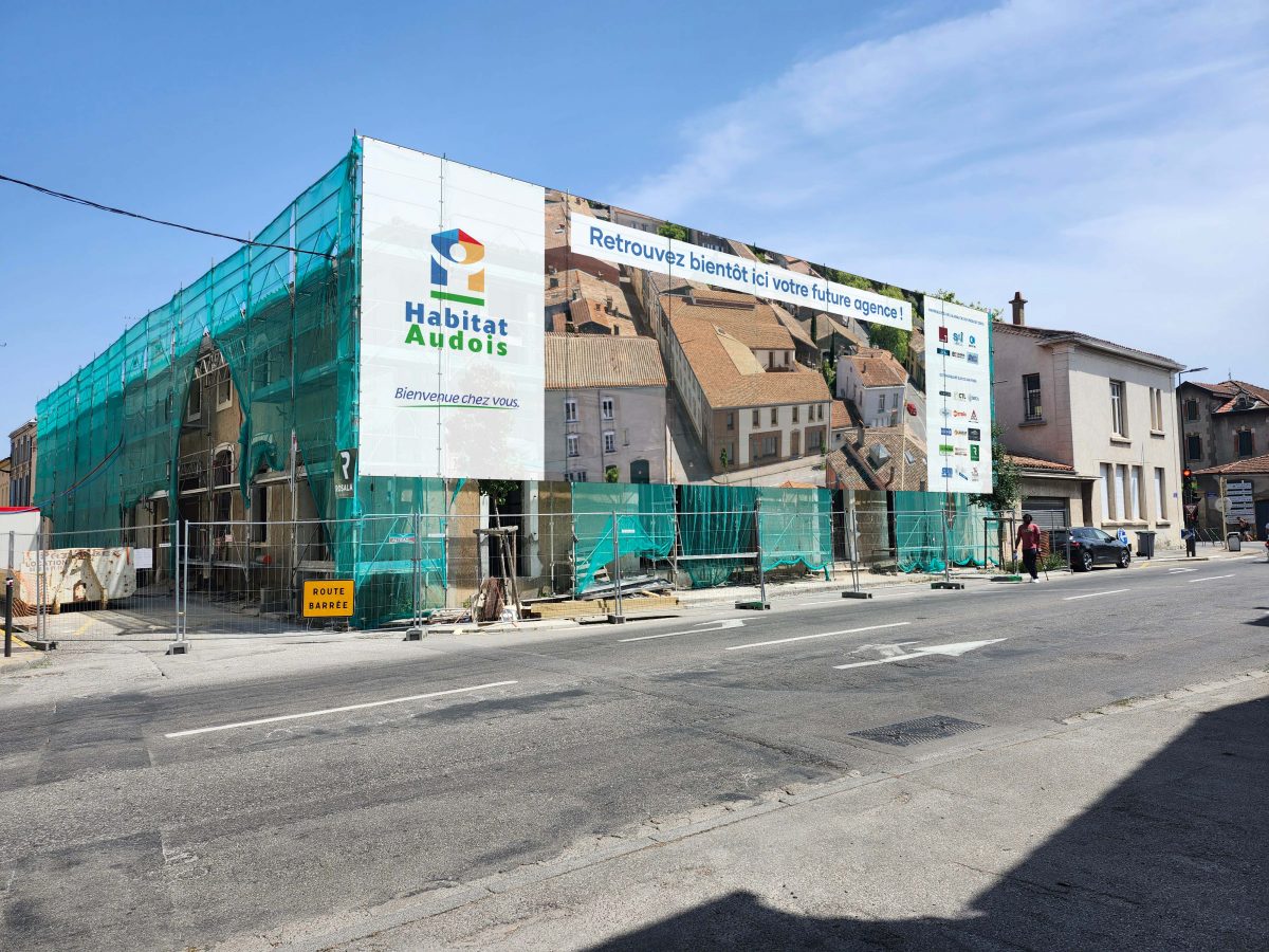 Une bâche de 22 mètres de long par 6 mètres de haut, réalisée en plusieurs parties, vient annoncer l’ouverture prochaine de la toute nouvelle agence Habitat Audois à Carcassonne.